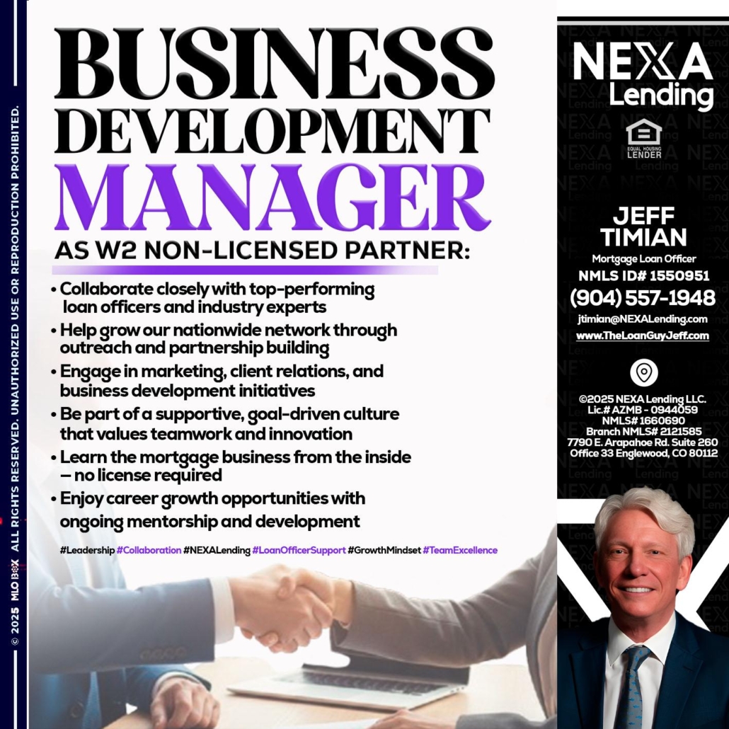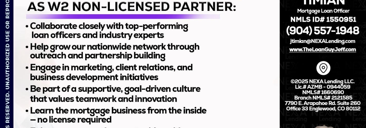 Hi, my name is Jeff Timian. I’m a Loan Officer with NEXA Mortgage LLC., offering personalized mortgage solutions, fast customized quotes, great rates and service with integrity.