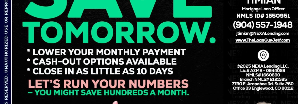 REFI TODAY SAVE TOMORROW - Jeff Timian -Mortgage Loan OfficerHi, my name is Jeff Timian. I’m a Loan Officer with NEXA Mortgage LLC., offering personalized mortgage solutions, fast customized quotes, great rates and service with integrity.