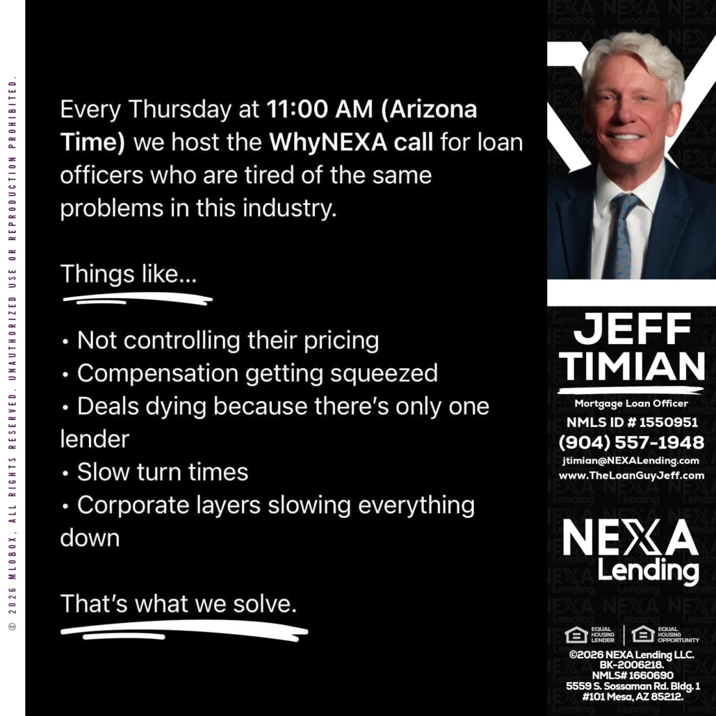 Hi, my name is Jeff Timian. I’m a Loan Officer with NEXA Lending LLC., offering personalized mortgage solutions, fast customized quotes, great rates and service with integrity.
